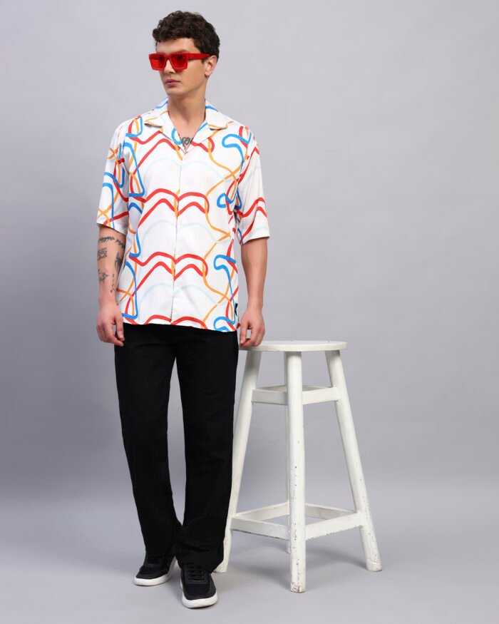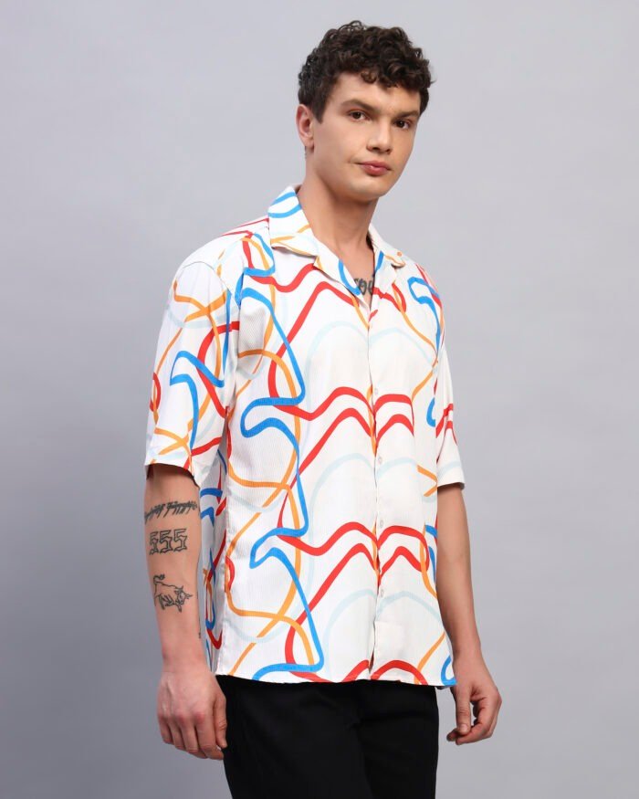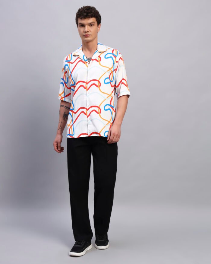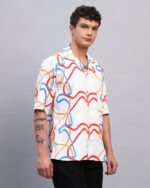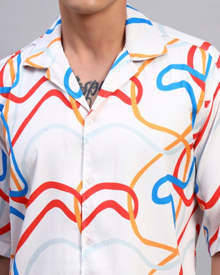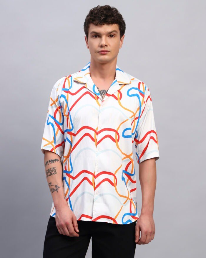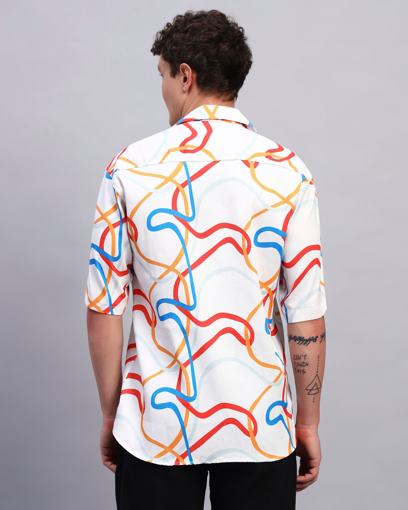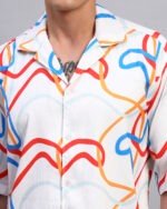 Step into vibrant ease with this multicolor ribbon wave print shirt crafted for you. Cut in a box fit, this shirt balances playful energy with a premium feel, ideal for vacations, brunches, or adding a pop to your casual days. Featuring a full sleeve and spread collar, it offers a versatile layer for your everyday odyssey.