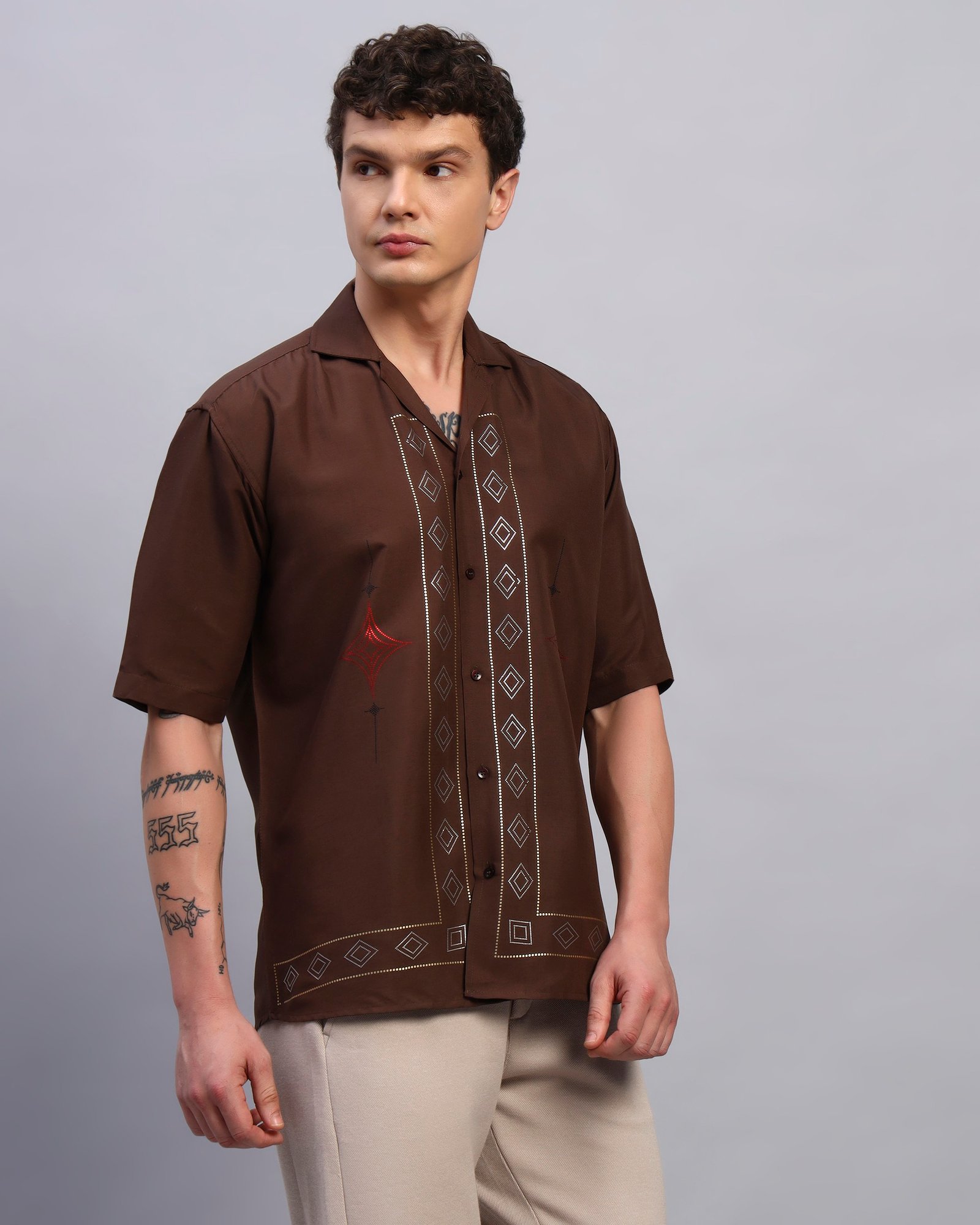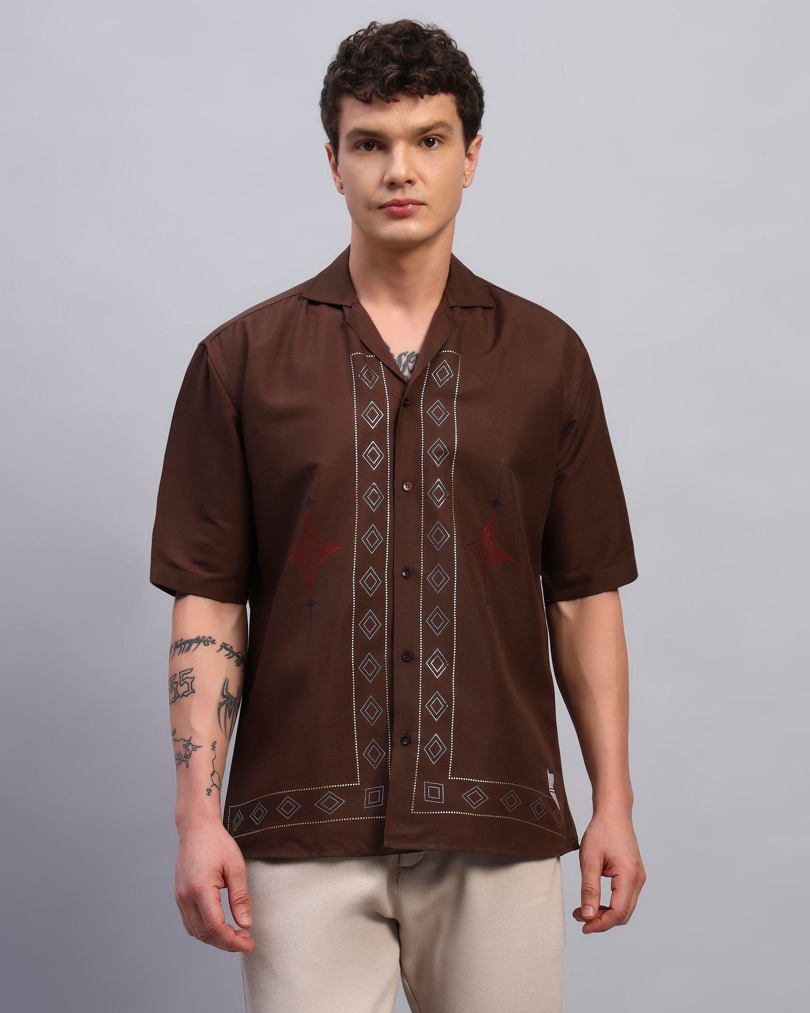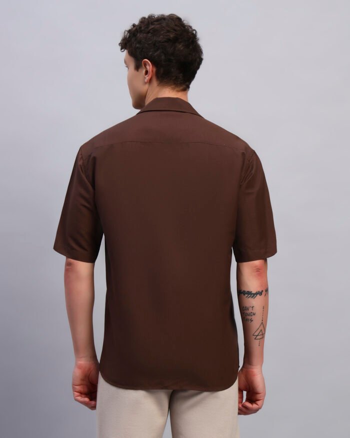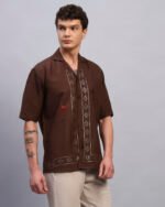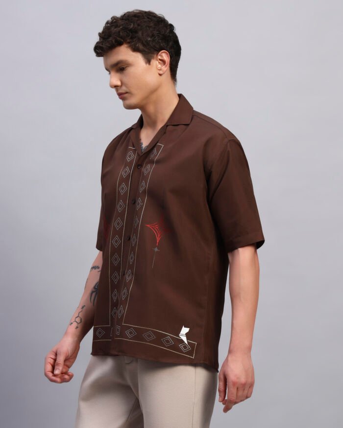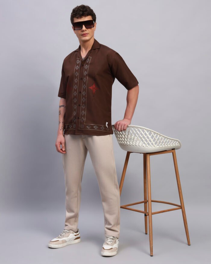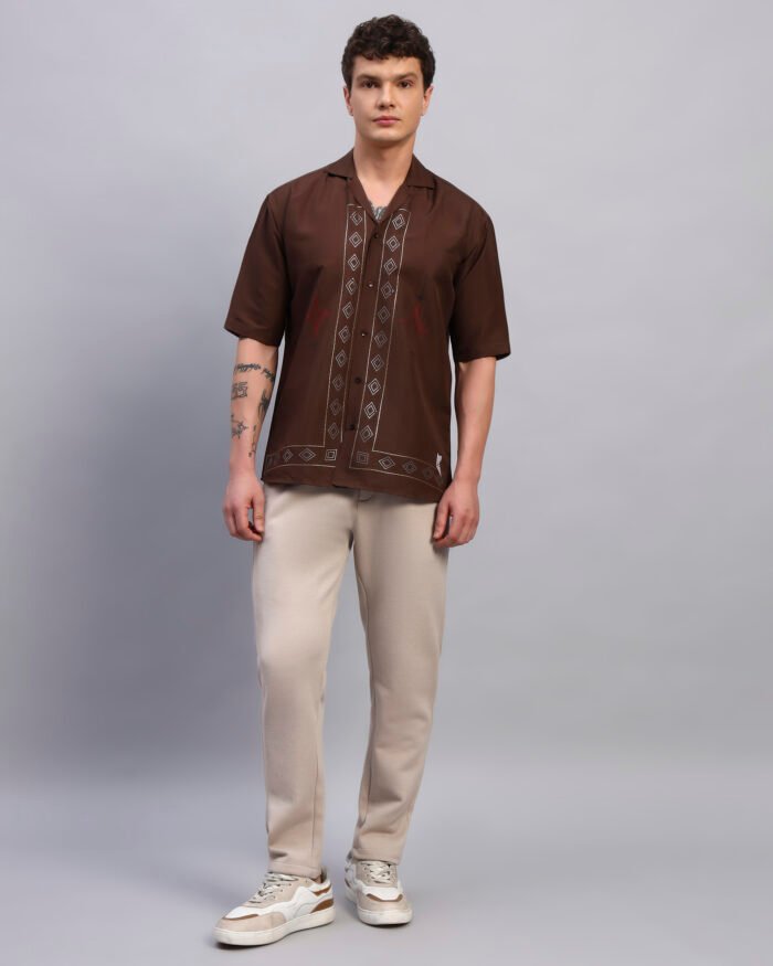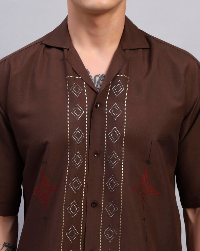Elevate your everyday with this rustic brown cotton shirt featuring clean geometric spangled accents. Designed for a relaxed fit with a cuban collar, it offers subtle shine that transitions seamlessly from day plans to sundown outings.