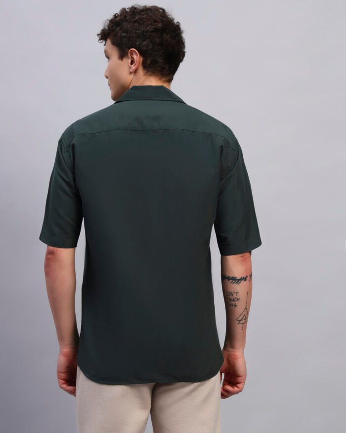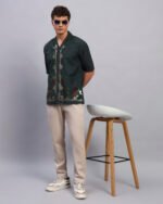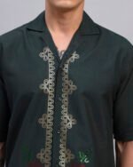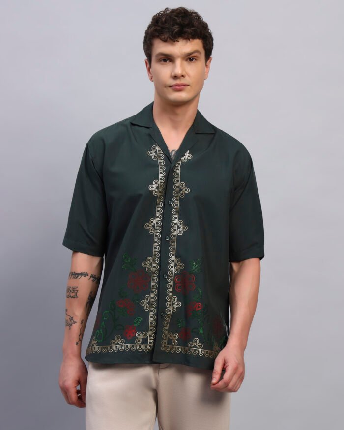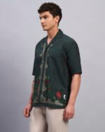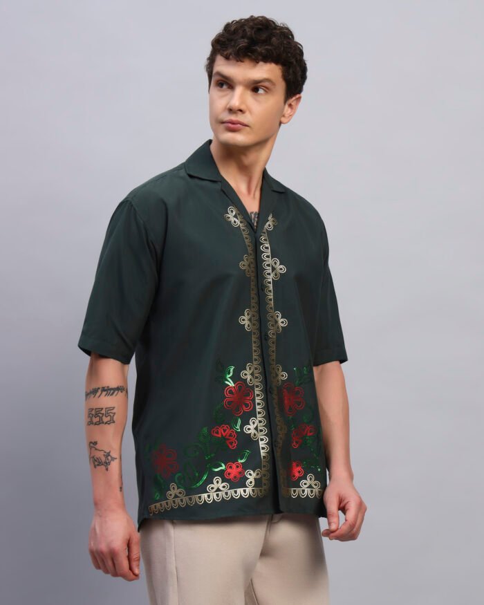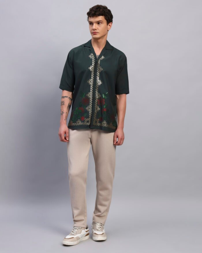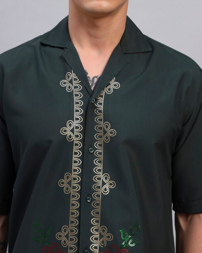 Step into understated vibrance with this deep forest green shirt adorned with floral spangle detailing. Crafted from soft, breathable cotton, its relaxed fit pairs laid-back comfort with a touch of festive shimmer, perfect for resort evenings or casual gatherings.