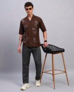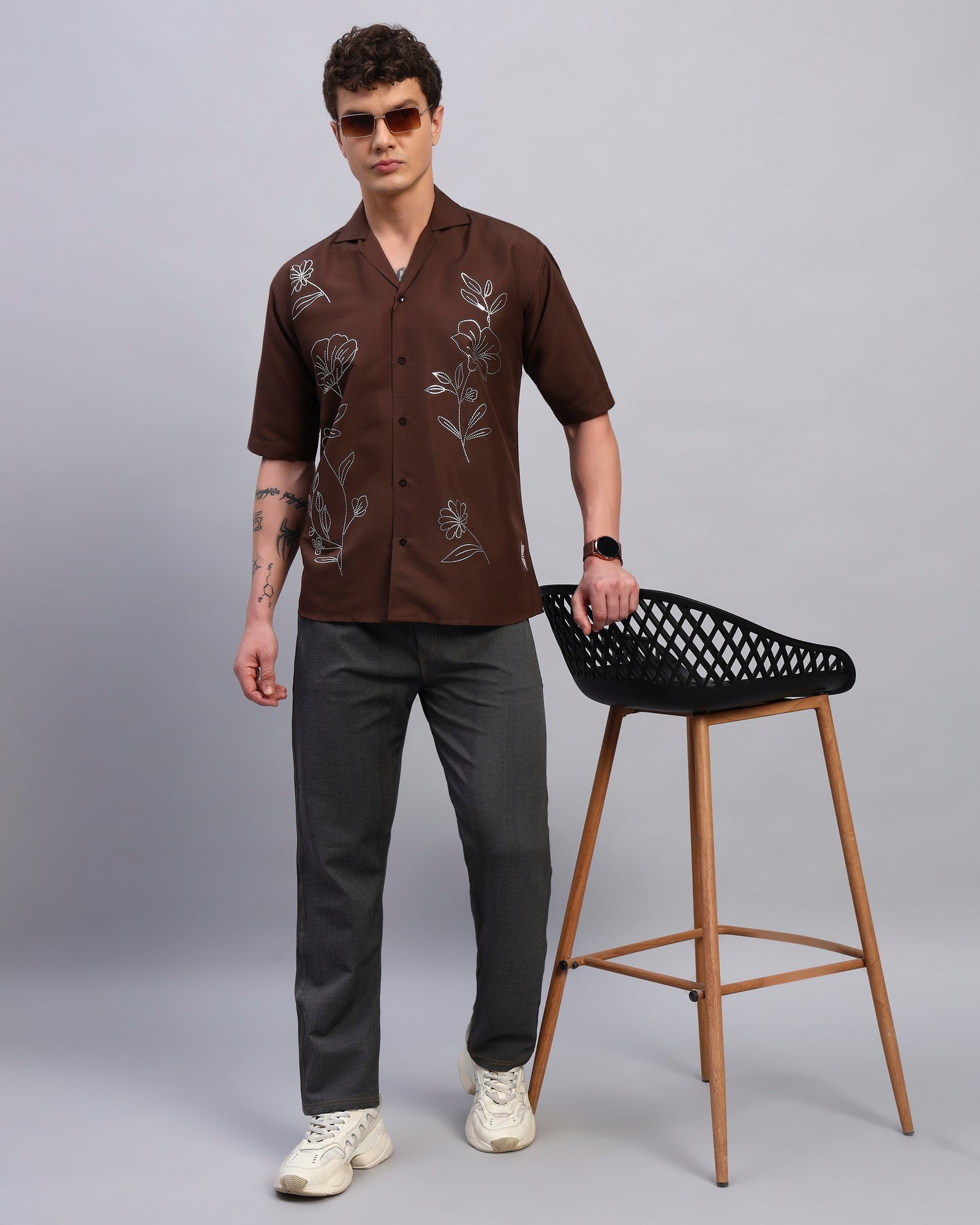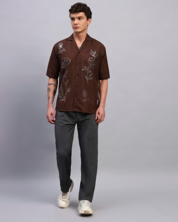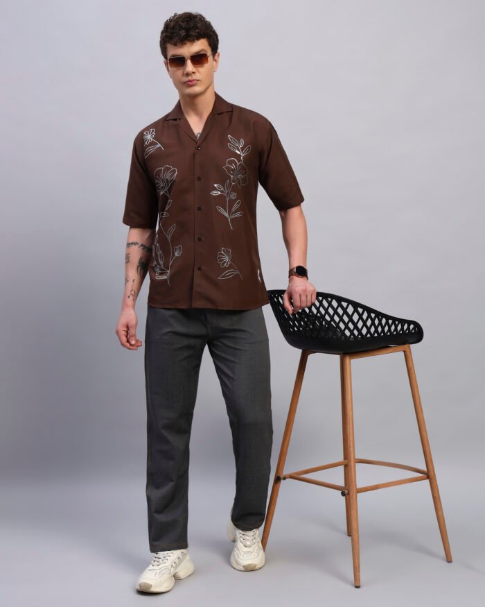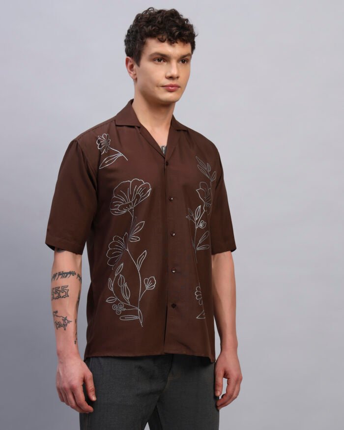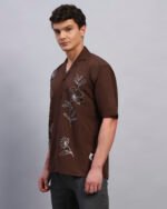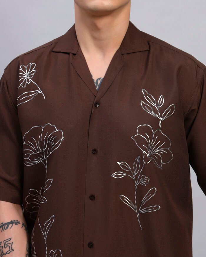 Refresh your wardrobe with the Cocoa Bloom shirt, featuring delicate floral hot-fix spangle detailing on rich brown cotton. Its relaxed drape and subtle shimmer let you transition effortlessly from travel days to evening plans while keeping your look crisp yet playful.